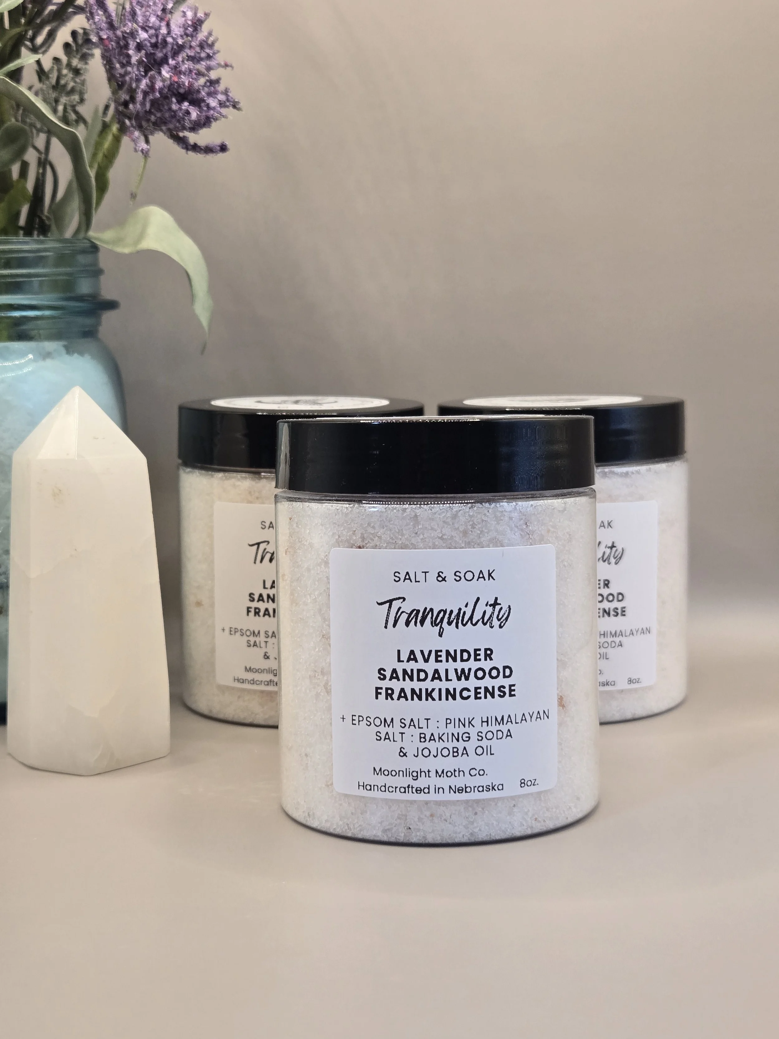 The "Tranquility" experience is built on a restorative base of Epsom and Pink Himalayan salts to melt away physical tension, while Baking Soda and Jojoba Oil work together to leave your skin feeling silky and replenished.