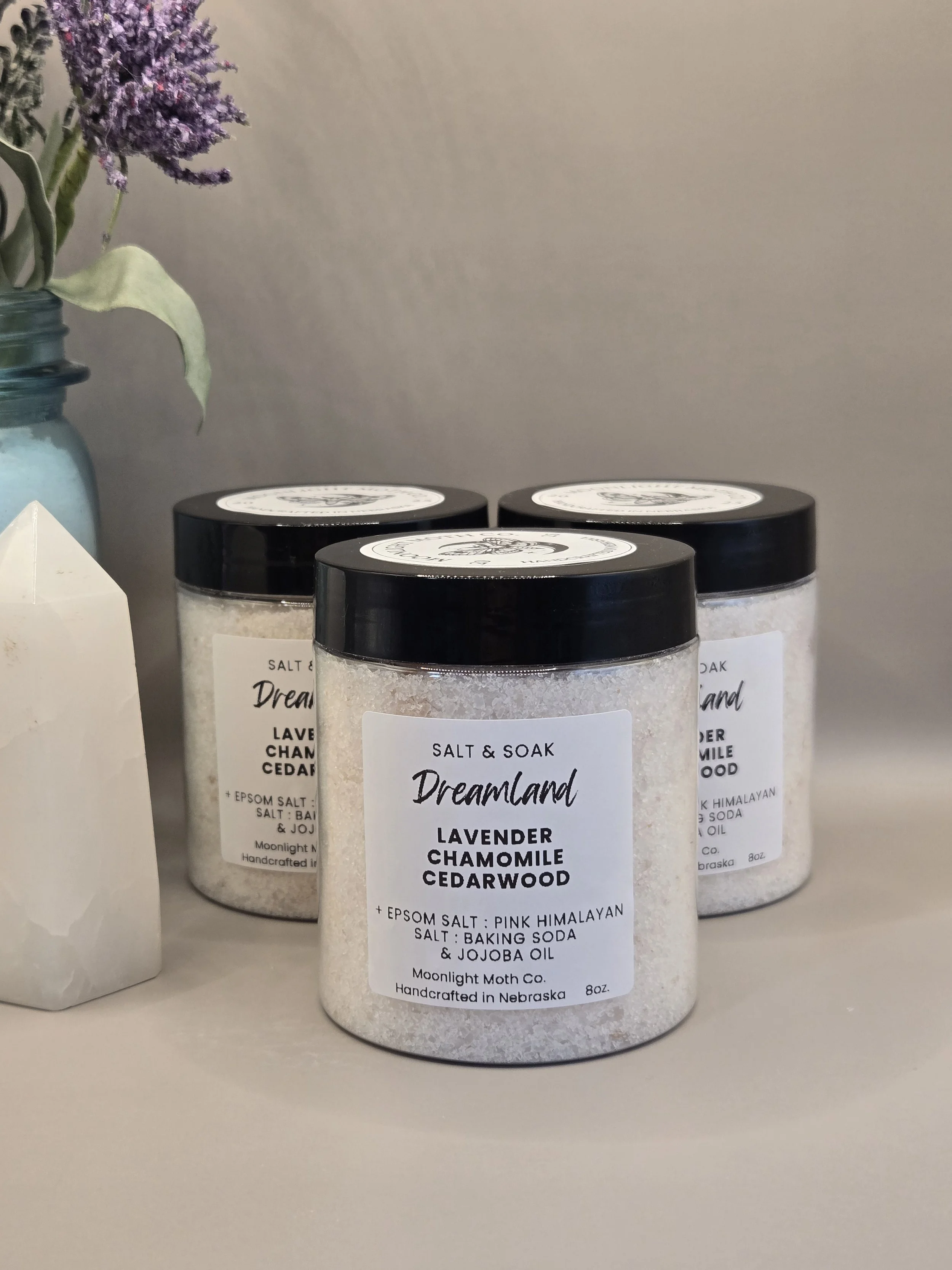 Key Ingredients: Epsom Salt, Pink Himalayan Salt, Baking Soda, Vitamin E, and Jojoba Oil.
